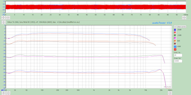 You will remember from before that the unmodified deck's saturation performance limited treble extension on the 0dB and -10dB curves, with -3dB already being reached well below 10kHz. With the modified record and playback equalisers this improved significantly, as can be seen in the following frequency sweeps (top to bottom UR, Metal XR, SXII):